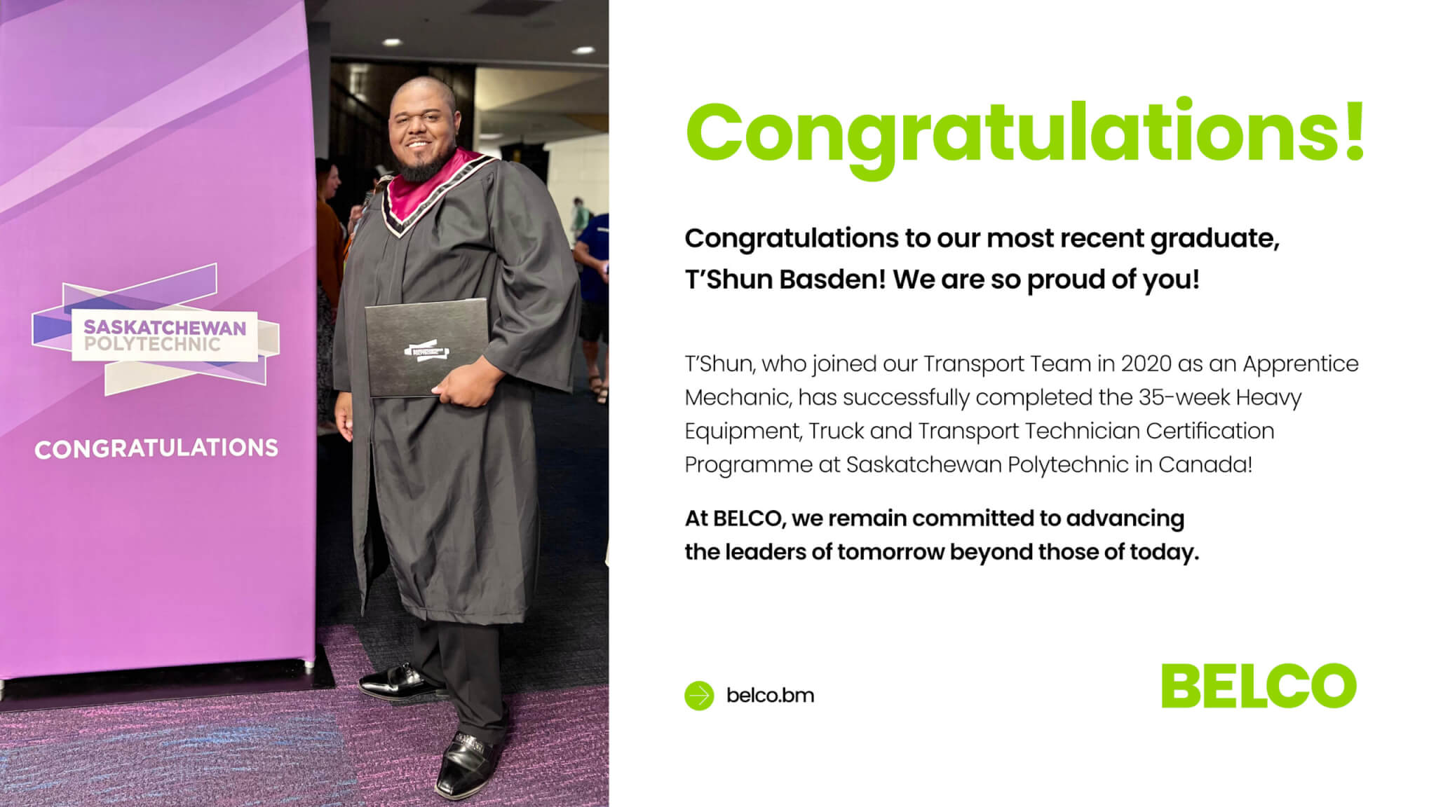 BELCO apprentice, T’Shun Basden, is currently enrolled in the academic 35-week programme Heavy Truck and Transport Certification Programme at Saskatchewan Polytechnic, Canada, that began in September 2022.