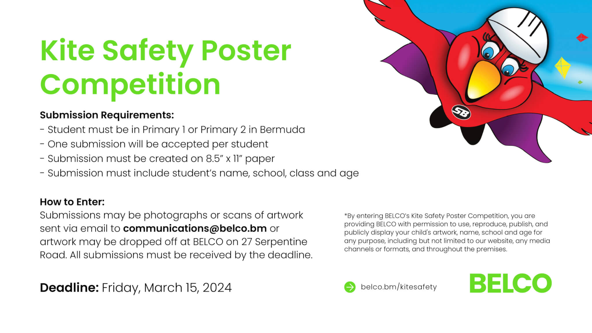 The competition is open to Primary 1 and Primary 2 students only with one entry per child permitted. All submissions must be on an 8.5” x 11” paper and either be photographed or scanned and emailed to  or delivered to BELCO, located on 27 Serpentine Road, Pembroke. All submissions must include the child’s name, age and school in the email or on the back of the entry.