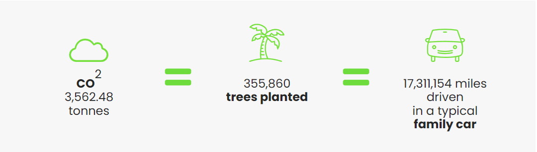 Through a partnership with Climate Wise, we have been offsetting the carbon footprint of each one of our employees in order to bring our entire team to a state of carbon neutrality. To date we are proud to share that we have been able to offset 3,562.48 tonnes of CO2, which is the equivalent to the emissions produced from driving a typical family car 17,311,154 miles.