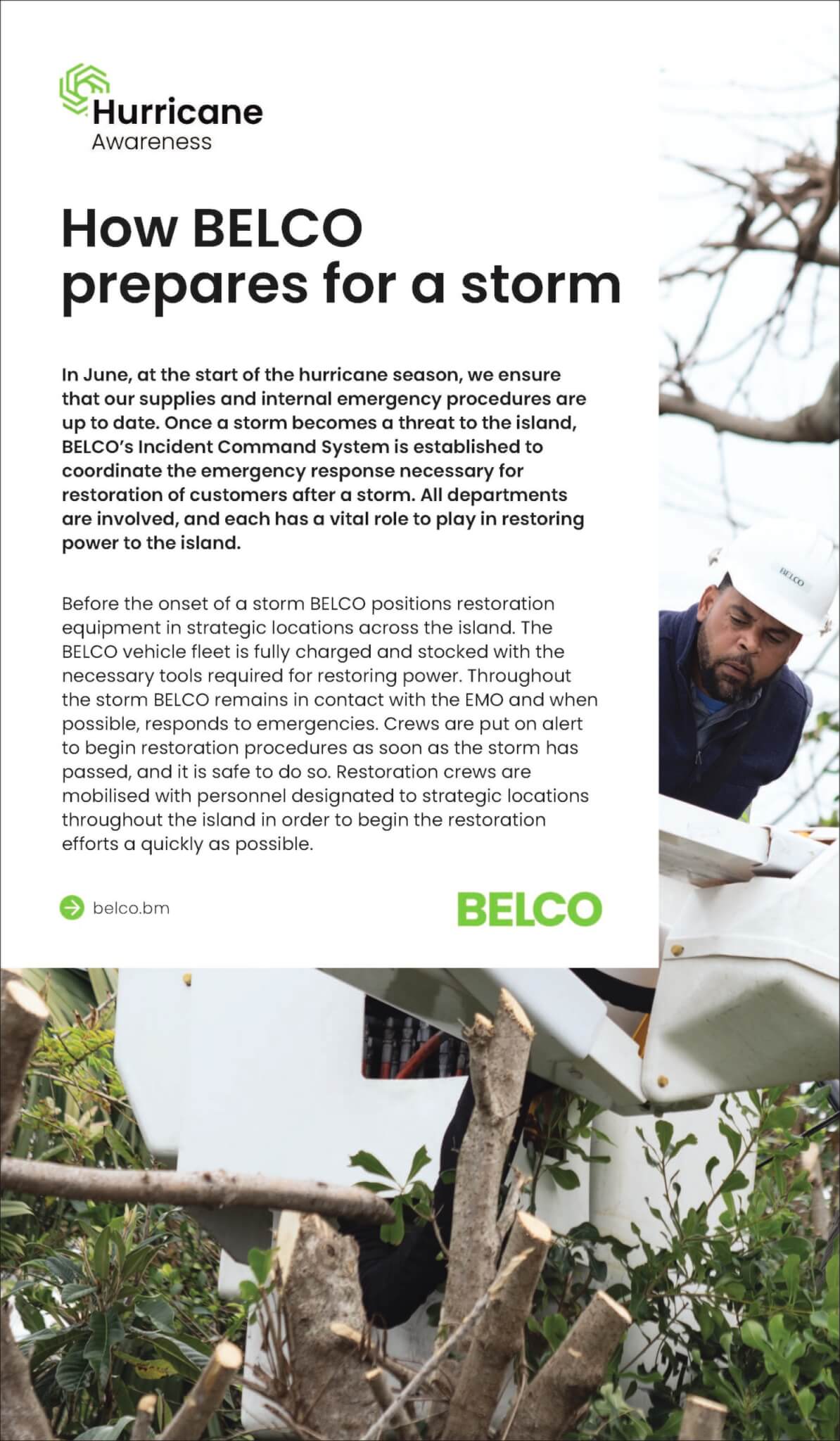 BELCO advised that with hurricane season beginning on June 1st, the Company has and is taking all the necessary steps to prepare should the island be impacted by a storm this season and encourages the public to prepare as well, specifically as preparations pertain to the trimming of trees.
