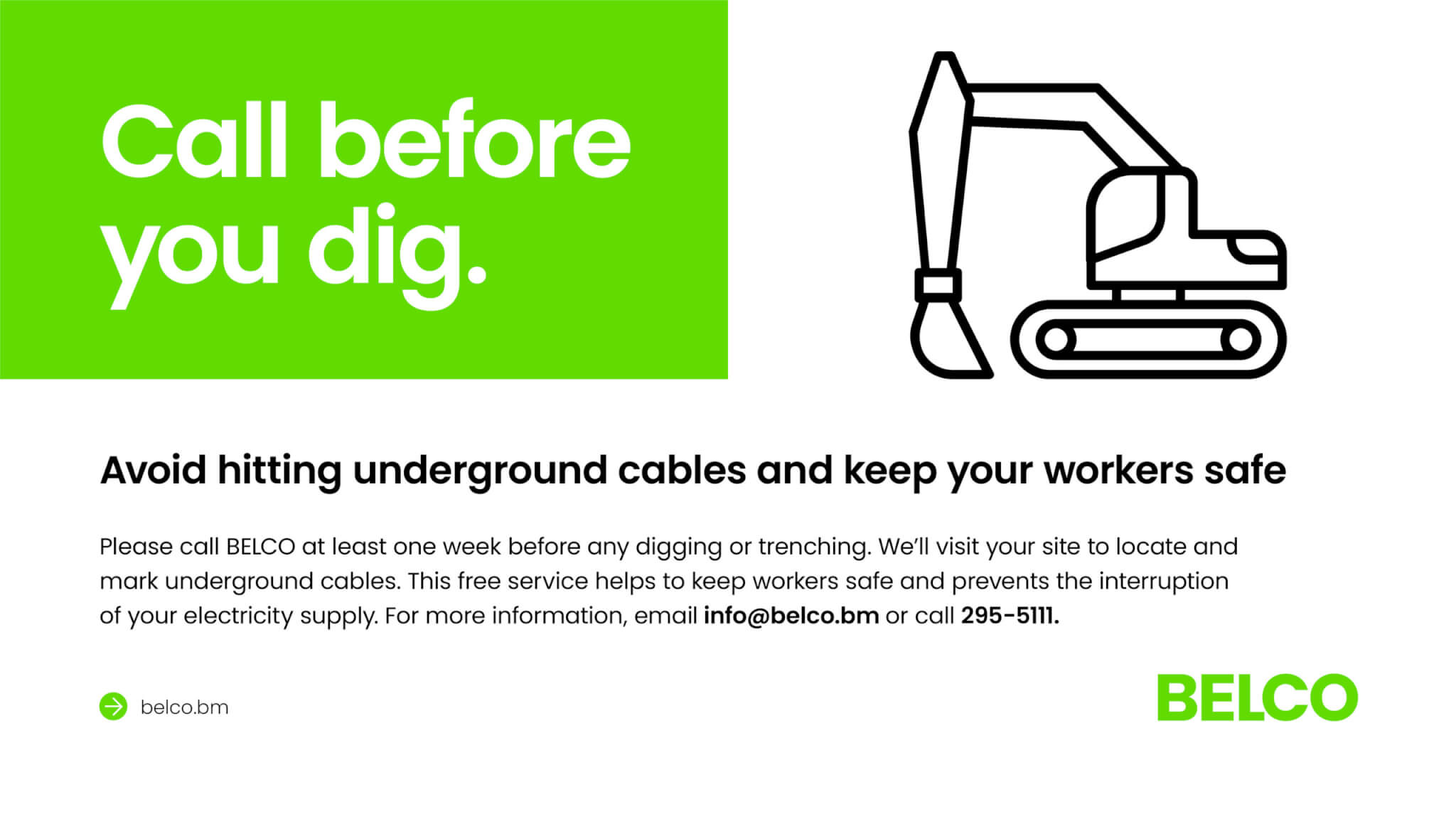 Please call (295-5111) BELCO at least one week before any digging or trenching. We’ll visit your site to locate and mark underground cables. This free service helps to keep workers safe and prevents the interruption of your electricity supply.